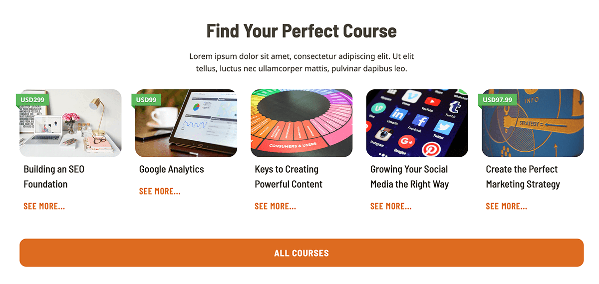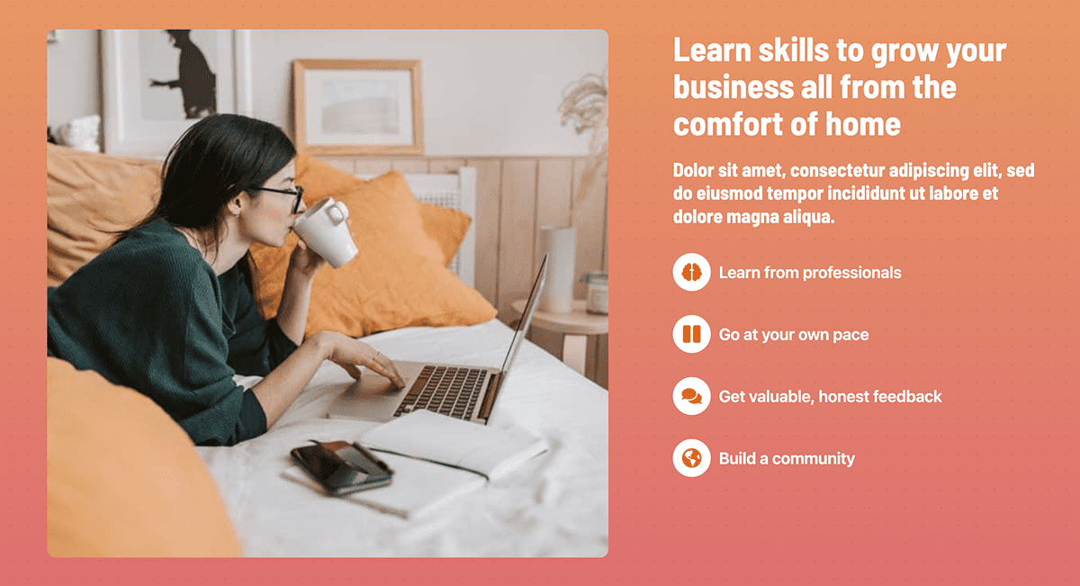 Royalty-free images and video get you started with professionalism and flair when you’re ready to share your expertise with the world. Monetize your courses or offer them (or just some) for free when you work with this stunning starter template.