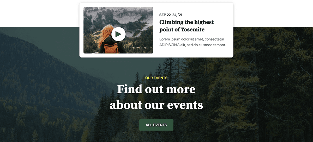 Yosemite is a breathtaking destination unparalleled by any other place on earth. The Yosemite starter template comes as close as you can to this majestic travel destination while still being online. We’re certain your business has similar views and amenities, and the Yosemite starter template is ready to help you show those to the world. With numerous ways to share amenities, events and accommodations, Yosemite is one of the most stunning starter templates that Kadence offers.